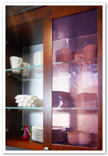Colored glass inserts in kitchen cabinet doors, pantry doors or decorative windows can make your kitchen more enjoyable to prepare food and entertain in. Even if you prefer neutral colors or natural wood and stone for your cabinets, walls and countertops, a splash of bright color through rich decorative glass inserts can add individuality and sparkle.